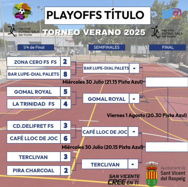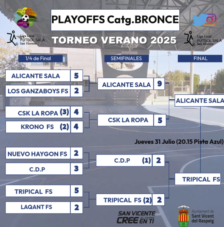 ¡Ya tenemos los finalistas de la categoría playoffs bronce: ALICANTE SALA Y TRIPICAL FS. La final se disputará el jueves 31 de julio, a las 20:15 horas en la Pista Azul. Se espera un partido muy disputado, en el que ambos equipos lucharan por alzarse con el título en juego. Los equipos prometen una final vibrante, y llena de emoción.