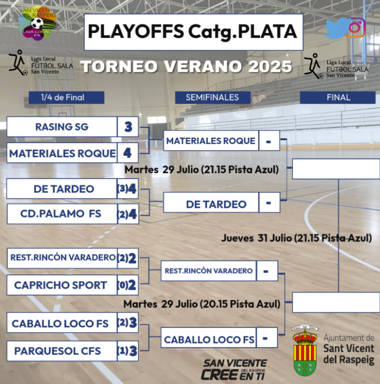 Las dos semifinales por los Playoffs categoría Plata tendrán lugar el martes 29 de julio, a partir de las 20:15 horas en la Pista Azul. Los cuatro equipos prometen unos partidos muy igualados y llenos de buen fútbol e ilusión, para poder alcanzar la final. Los cuartos de final han sido vibrantes, muy igualados y llenos de emoción y nervios. De los 4 partidos, tres tuvieron que decidirse en la tanda de penaltis.
